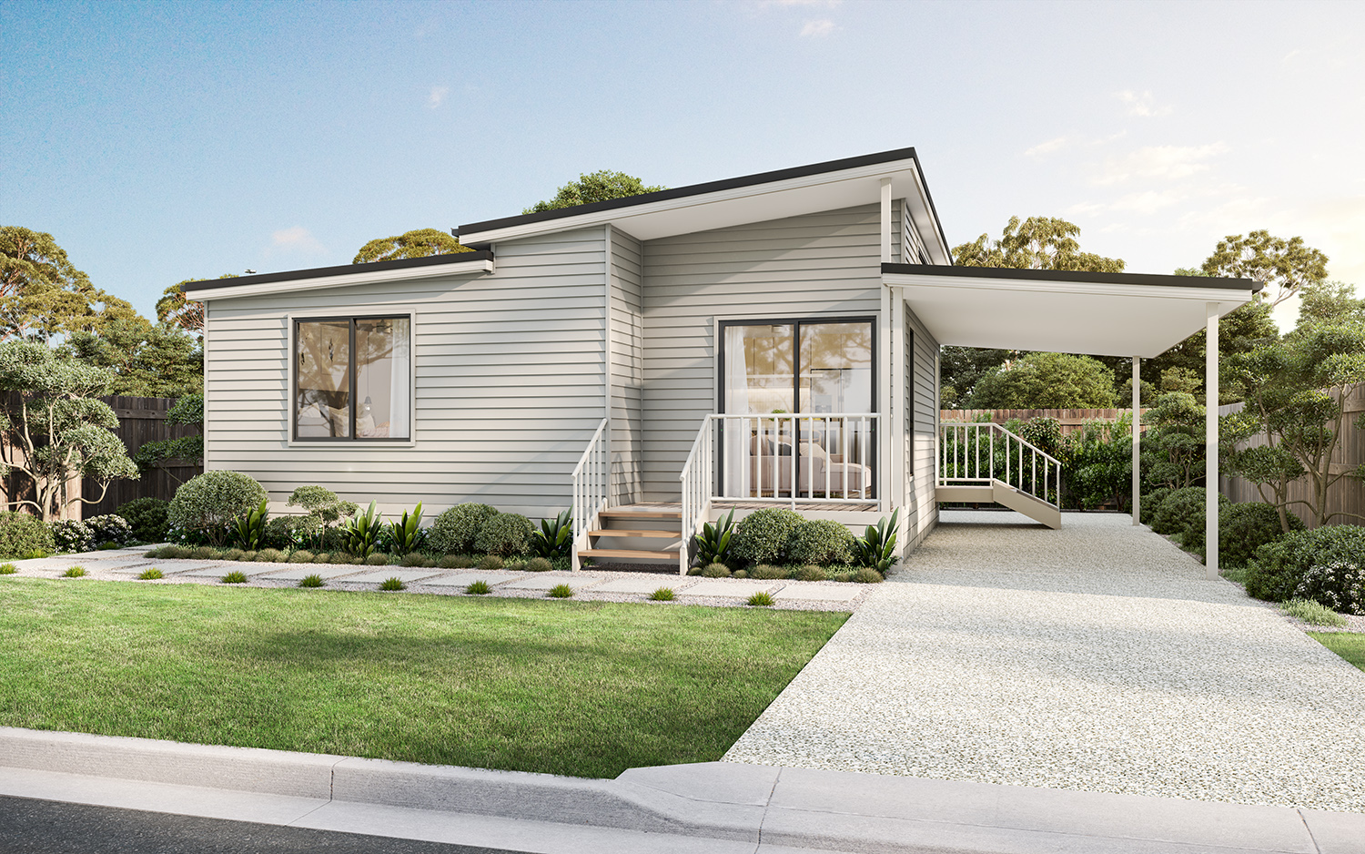 Welcome to The Aloha, a compact modular home designed to make everyday living easy and enjoyable. The open-plan kitchen, dining, and living area welcomes plenty of natural light, creating a bright and inviting hub. Two comfortable bedrooms provide private retreats, while a modern bathroom delivers everyday functionality with ease.