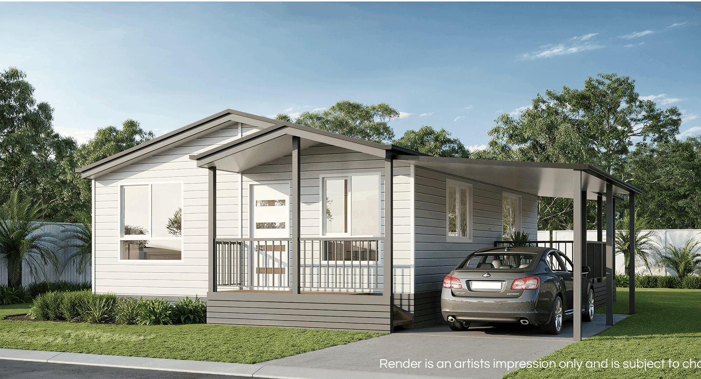 The Driftwood features a bright open-plan kitchen, dining, and living area that flows seamlessly onto a front deck for outdoor relaxation. The kitchen includes a 600mm appliance package with generous storage, while both bedrooms are carpeted with push underlay for added comfort.