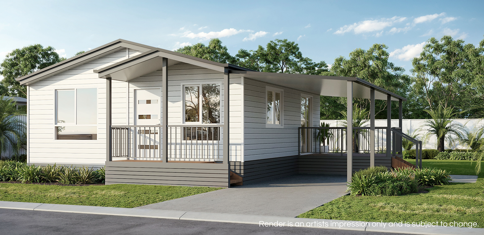 The front deck extends the living area outdoors, making it perfect for sunny days or evening retreats. Comfort essentials include reverse-cycle air-conditioning, LED down-lights, full insulation, and premium finishes throughout, completing this compact yet stylish two-bedroom modular home.