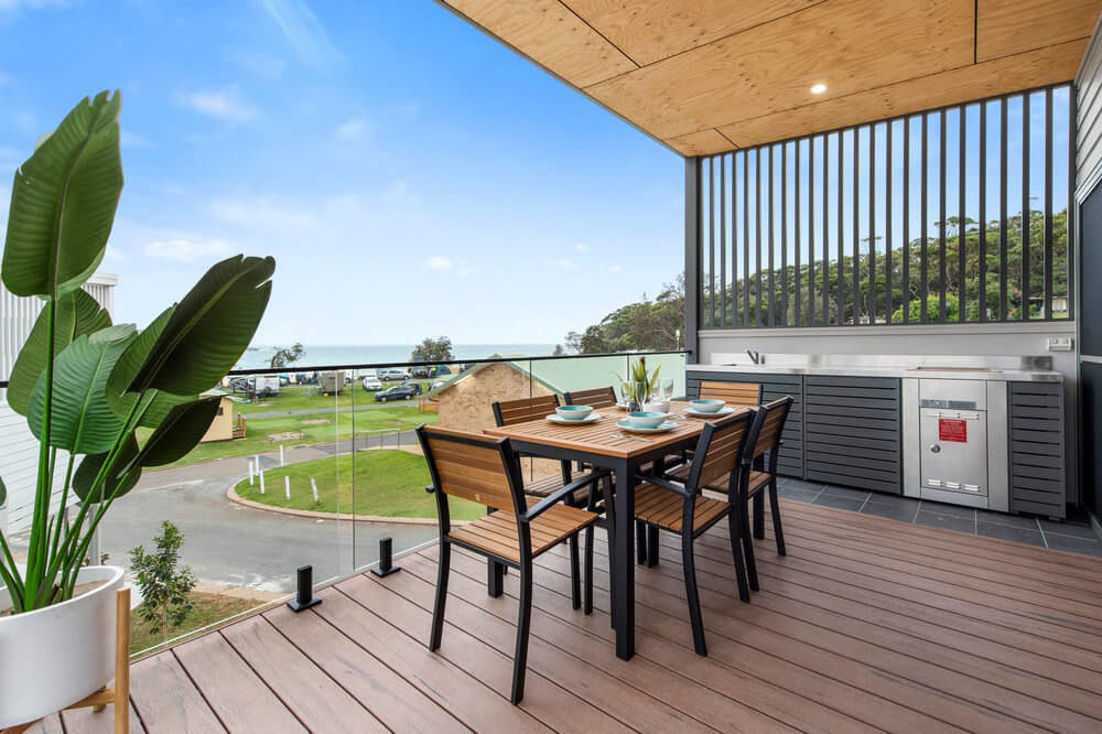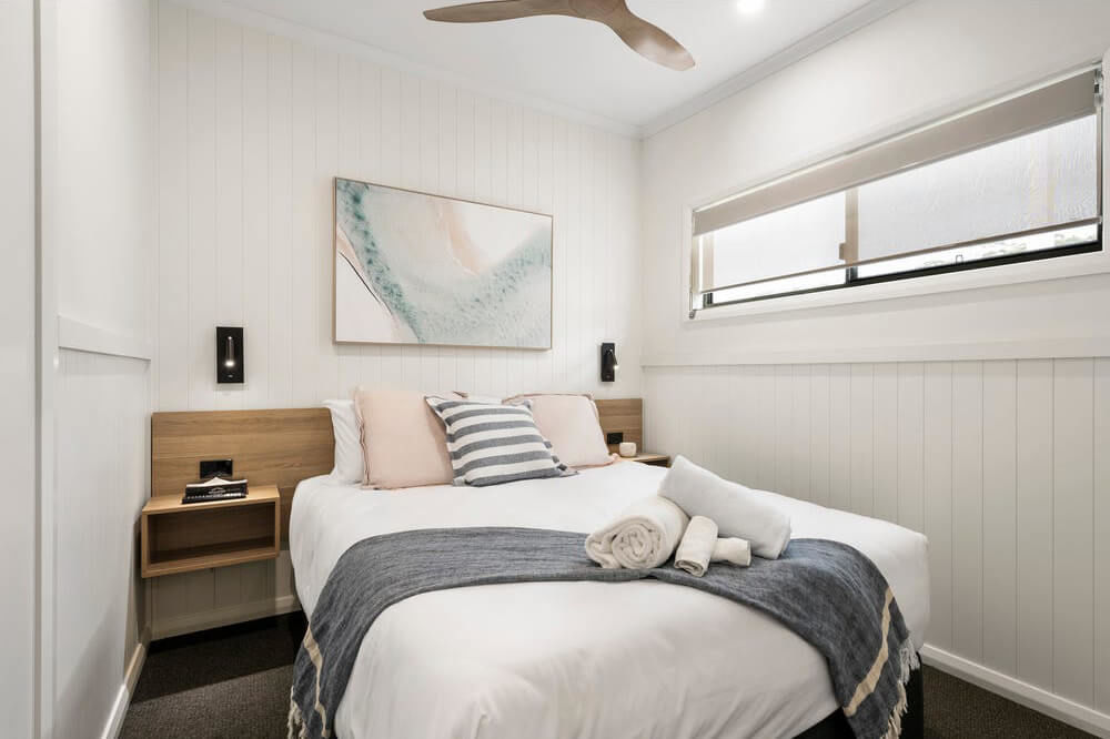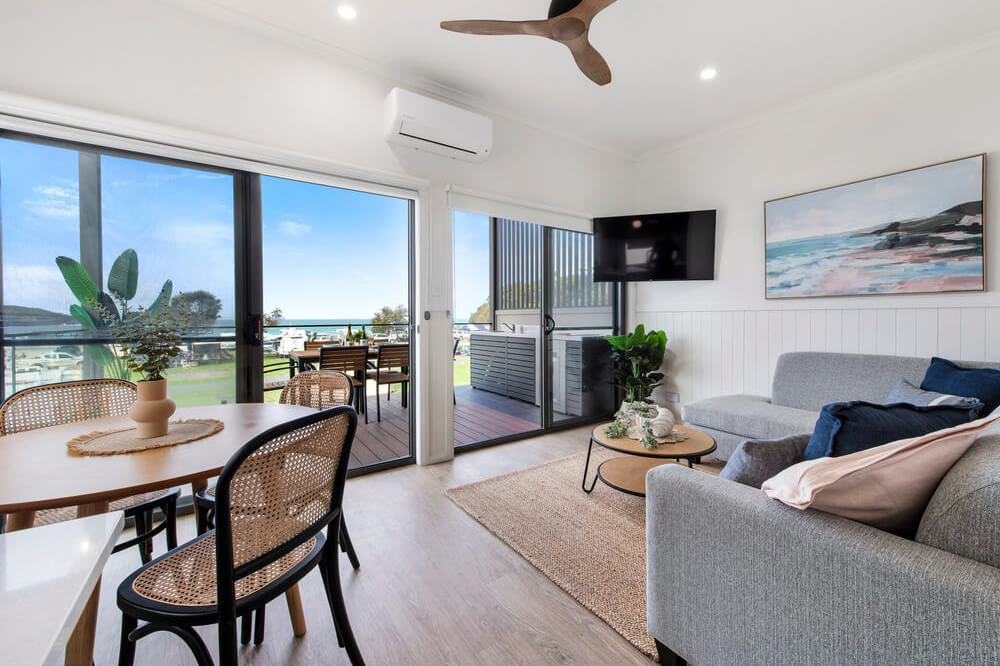 Both bedrooms are carpeted with plush underlay, while the modern bathroom features designer tiling and a large shower. The front deck extends the living area outdoors, perfect for morning coffee or sunset views. With reverse-cycle air-conditioning, LED downlights, full insulation, and a premium paint finish, comfort and practicality come built in.